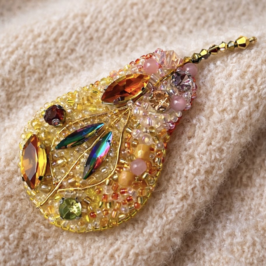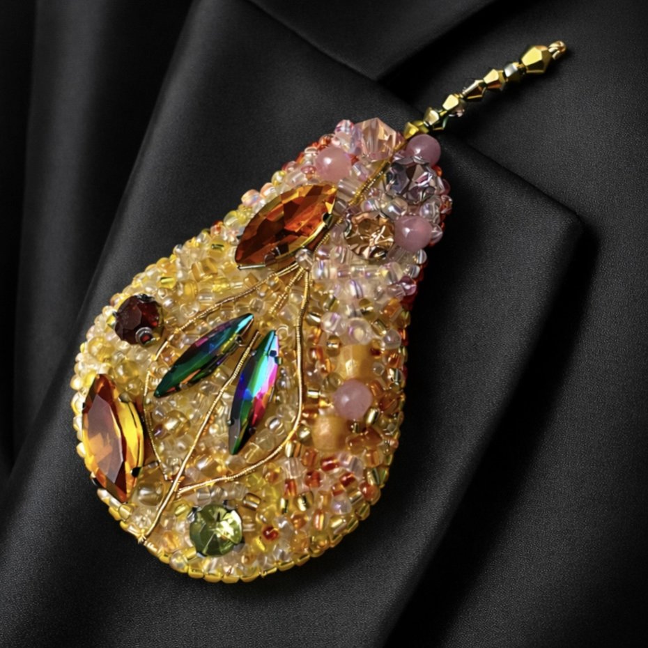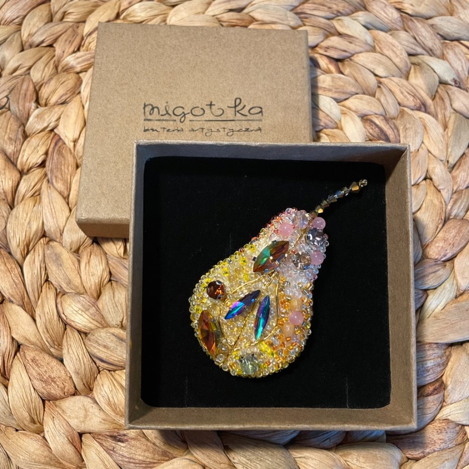 Ręcznie wykonana broszka w kształcie gruszki, stworzona techniką haftu koralikowego. Każdy element został starannie doszyty, tworząc subtelną, mieniącą się kompozycję w odcieniach złota, bursztynu i delikatnego różu. Kryształki i koraliki pięknie odbijają światło, nadając biżuterii elegancji i artystycznego charakteru.