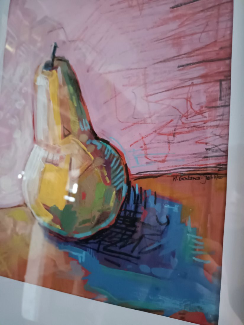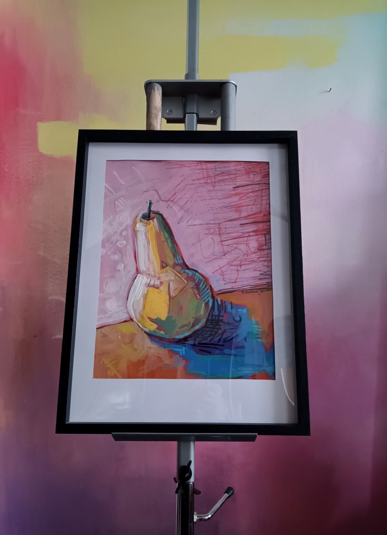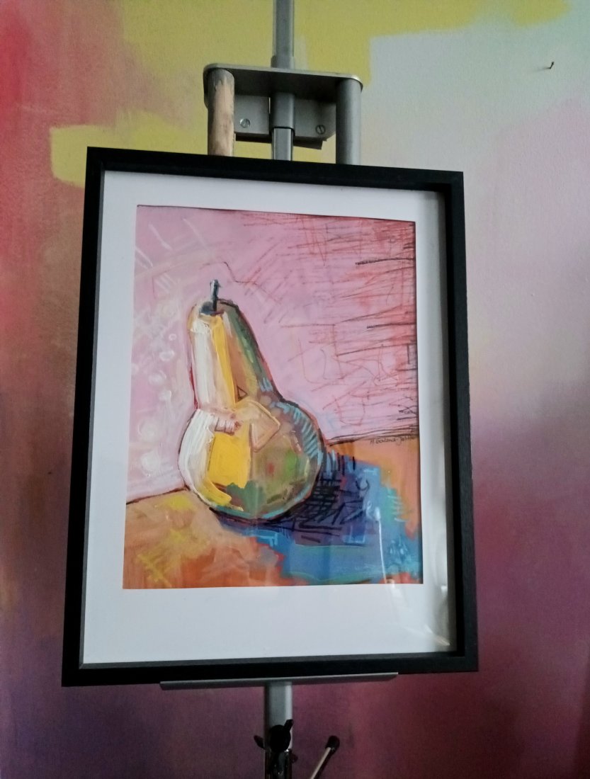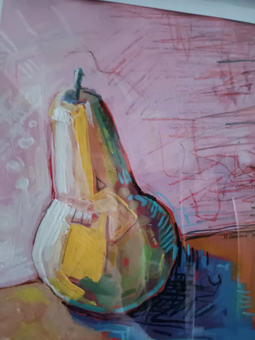Oprawiona praca przedstawiająca po prostu gruszkę. Praca wykonana na papierze, farbami, kredkami, mazakami.