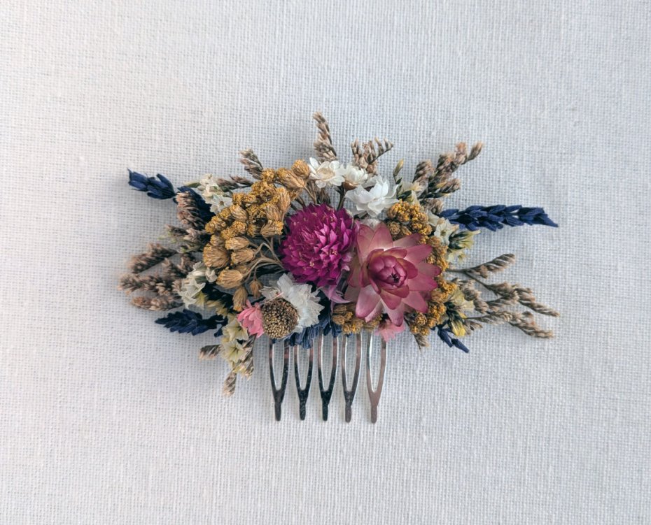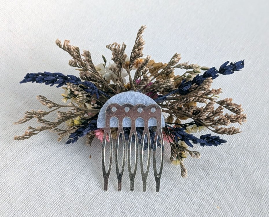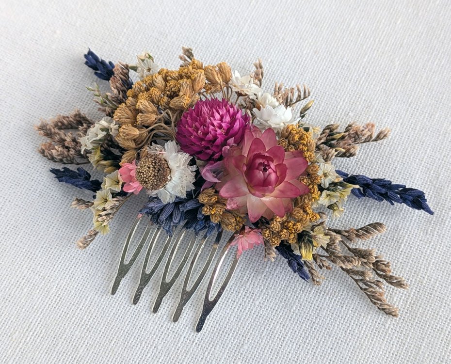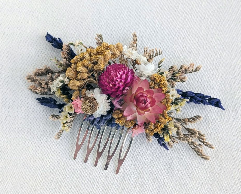 Romantyczny grzebyk do włosów "Różowa Łąka" wykonany z naturalnych, starannie suszonych kwiatów koniczyny i lawendy, które zachwycają delikatnością oraz subtelną paletą barw. Kompozycja w odcieniach różu, fioletu i lekkiej zieleni przywodzi na myśl letnią, kwitnącą łąkę pełną zapachów i spokoju. Każdy egzemplarz jest unikatowy dzięki ręcznemu wykonaniu oraz niepowtarzalnemu układowi roślin. Grzebyk jest lekki, a jednocześnie stabilny, dzięki czemu doskonale utrzymuje się we włosach, zapewniając komfort noszenia przez cały dzień. Idealnie sprawdzi się jako ozdoba do stylizacji ślubnych, sesji zdjęciowych, a także jako subtelny, naturalny akcent na co dzień.