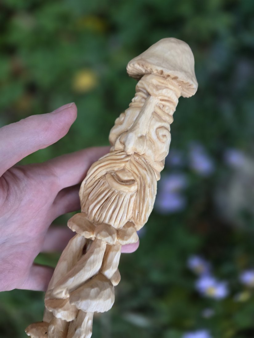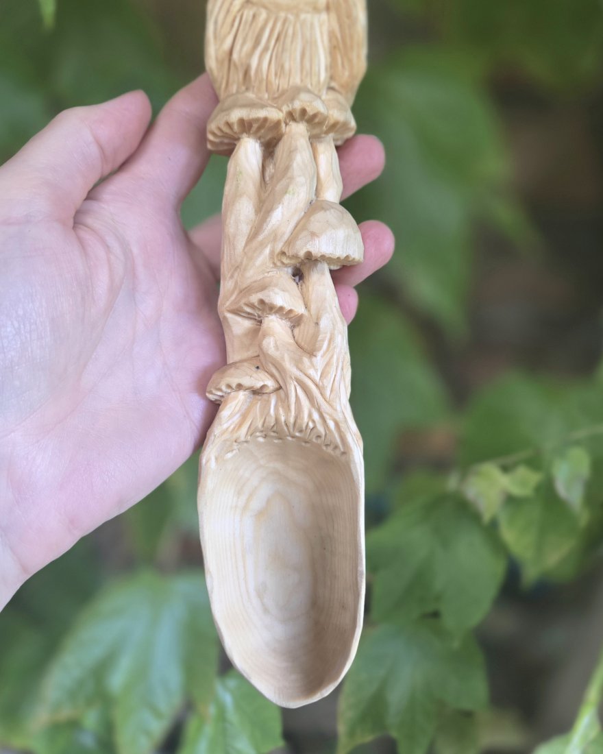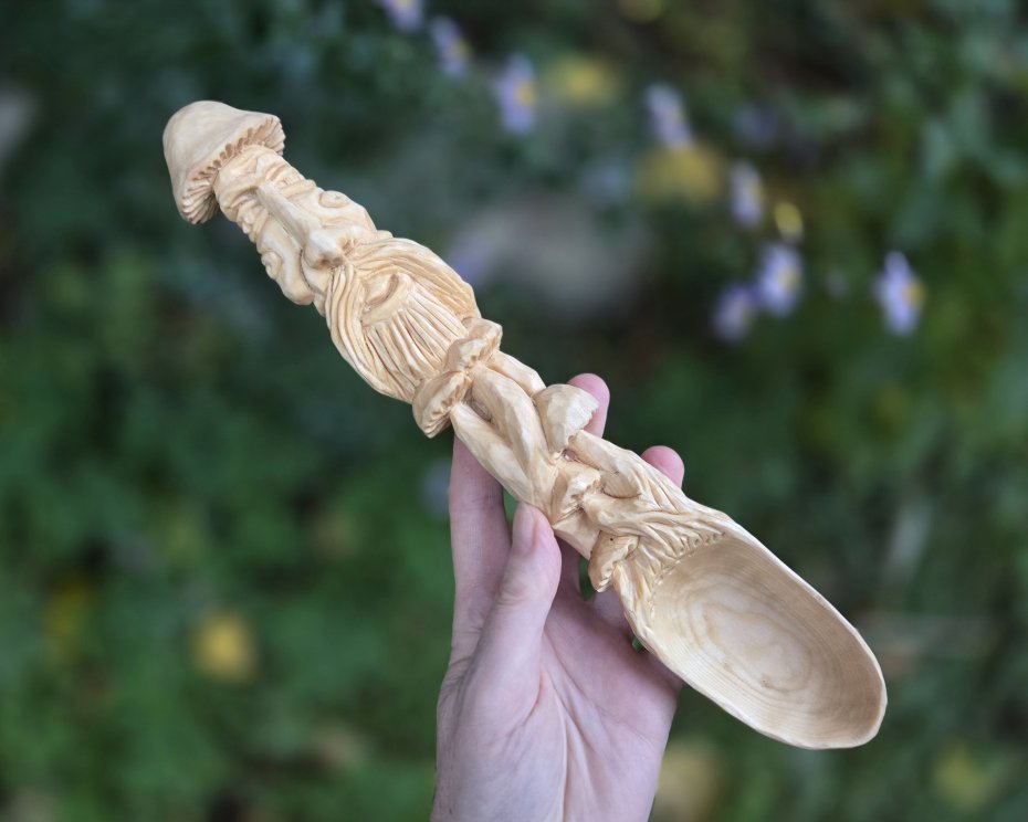 Łyżka ręcznie wykonana z drewna lipowego. Ma naturalny kolor drewna i unikalny kształt - wyrzeźbiłem ją w kształcie Grzybowego Króla, Władcy Lasu w otoczeniu grzybów. Łyżka jest gotowa do użycia, przydatna w kuchni. Można nią jeść, mieszać w garnku, stanowi doskonałą ozdobę stołu. Łyżka została zabezpieczona poprzez moczenie w oleju lnianym. Ma 30 cm długości.