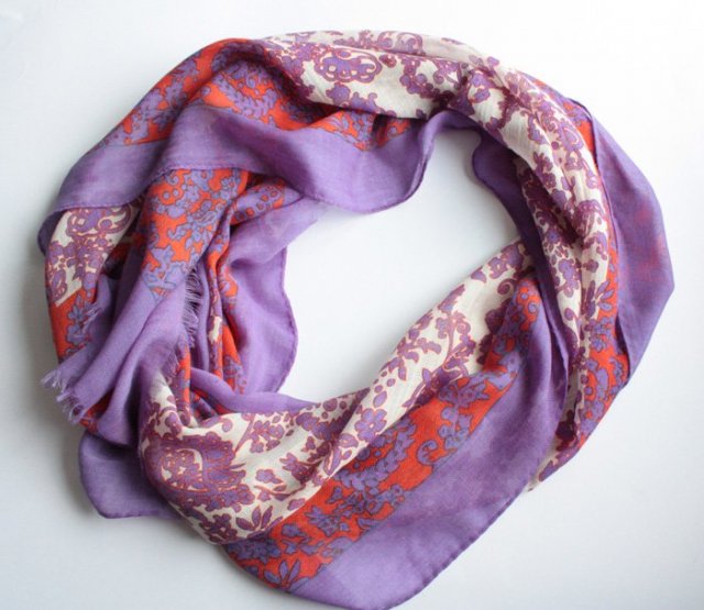 Przedstawiam Państwu wspaniały ekskluzywny szal GUCCI w przepięknych odcieniach mocnego wrzosowego fioletu, ceglastego pomarańczu i kremu. Dyskretny mały nadruk z nazwą marki. Miły w dotyku, doskonały jakościowo materiał (50% jedwab, 50% wełna). Materiał nie gryzie.