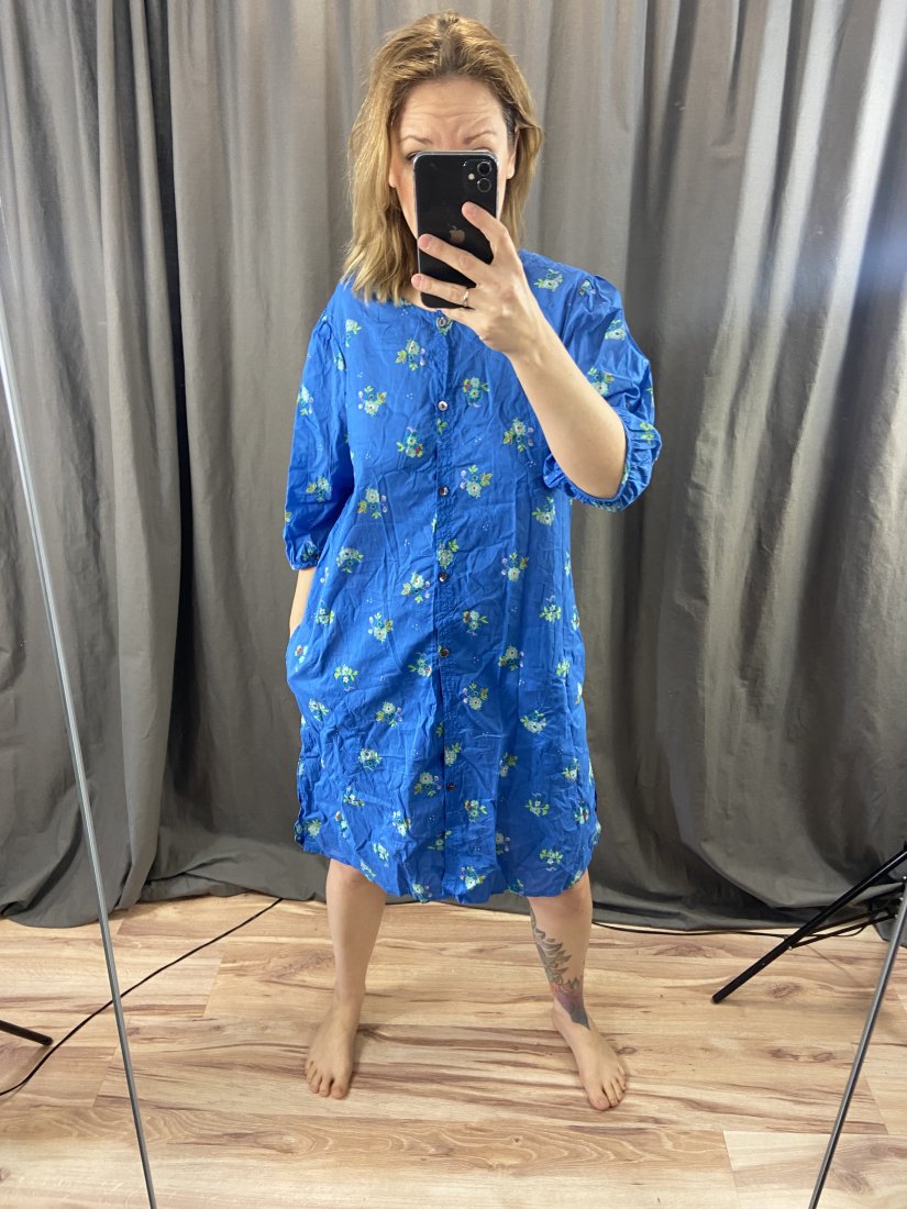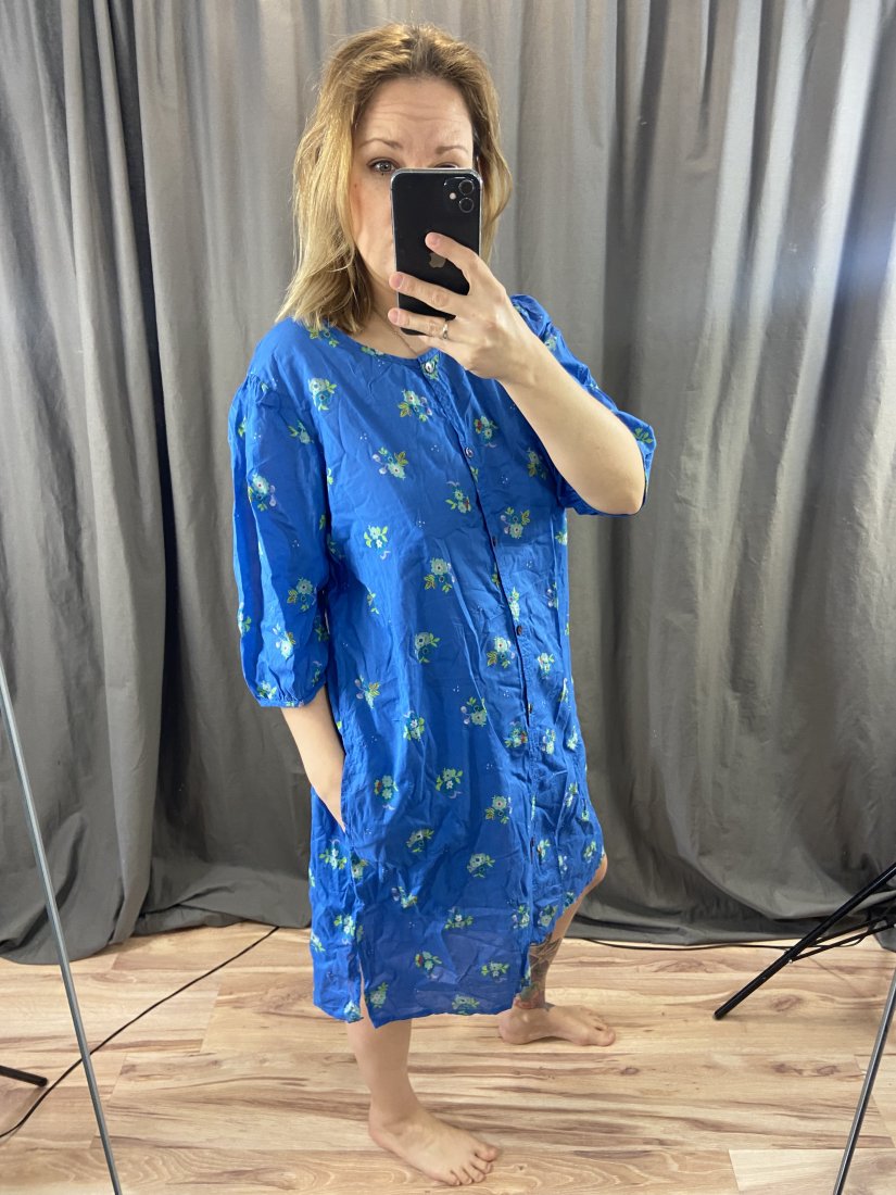 Sukienka/kaftan kultwej marki tworzącej z organicznych materiałów Gudrun Sjoden. Zapinana na rząd guziczków, w biodrach kieszenie. Cena nowej 94uero (na stronie marki można zobaczyć stylizacje z jej użyciem)