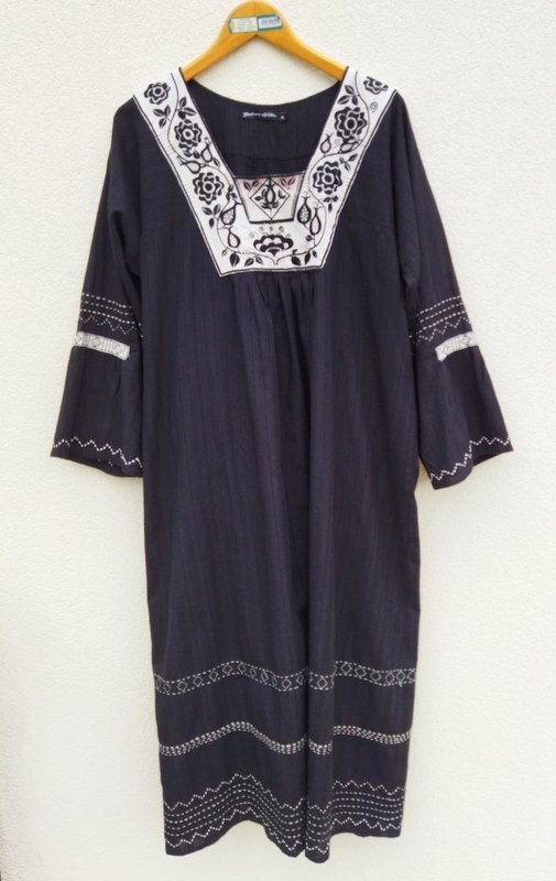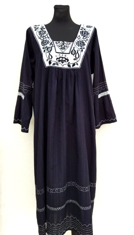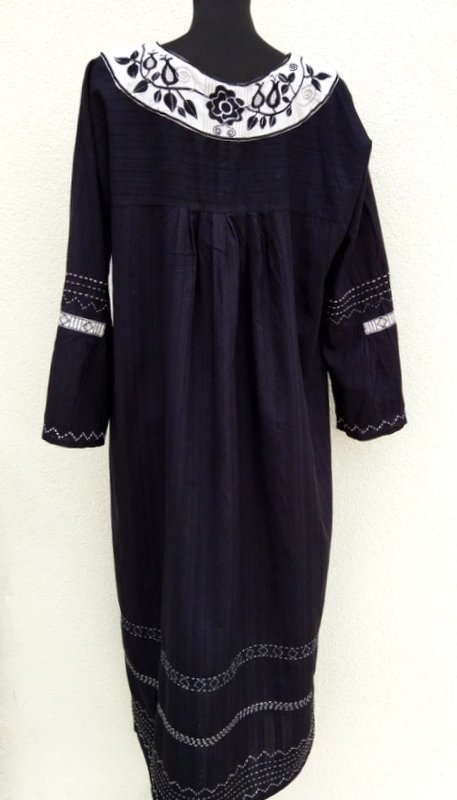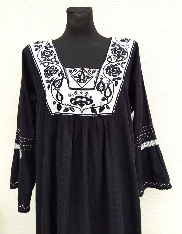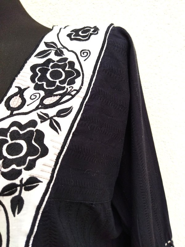 Luźna sukienka z czarnej tkaniny bawełnianej z domieszką wiskozy zdobiona naszywaną przy dekolcie i na rękawach wstawką w białym kolorze z czarno beżowym haftem oraz ozdobnymi przeszyciami białą , szarą i beżową przędzą. Rękawy krojone z całości materiału bez szwów przyramiennych.