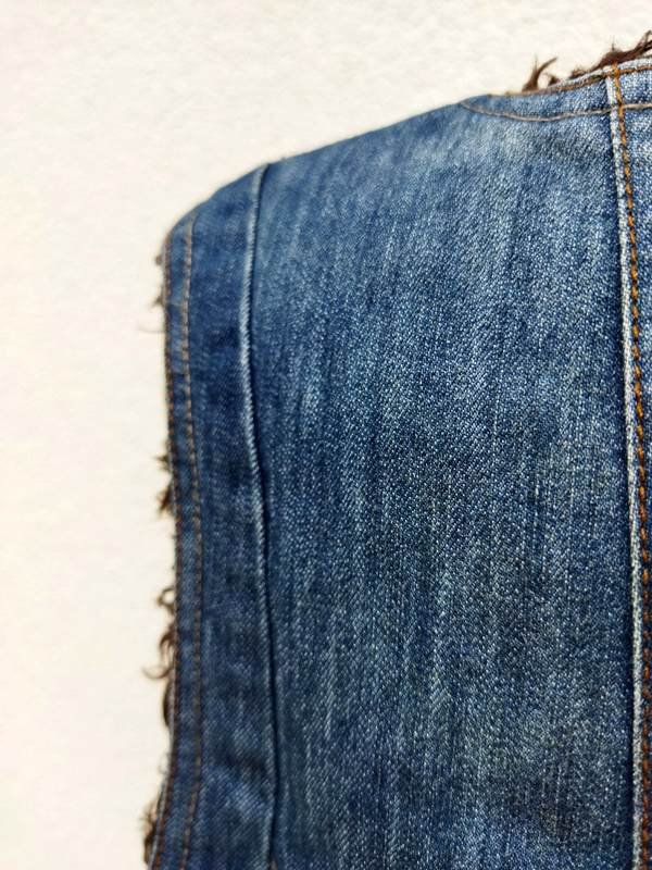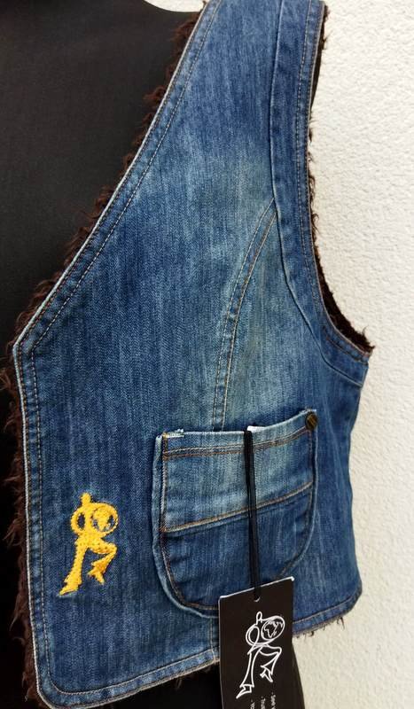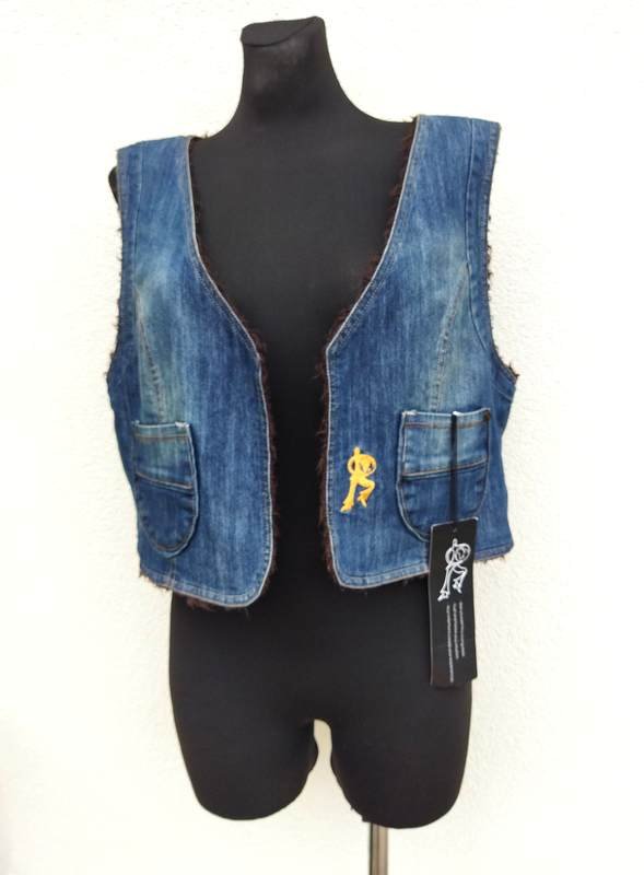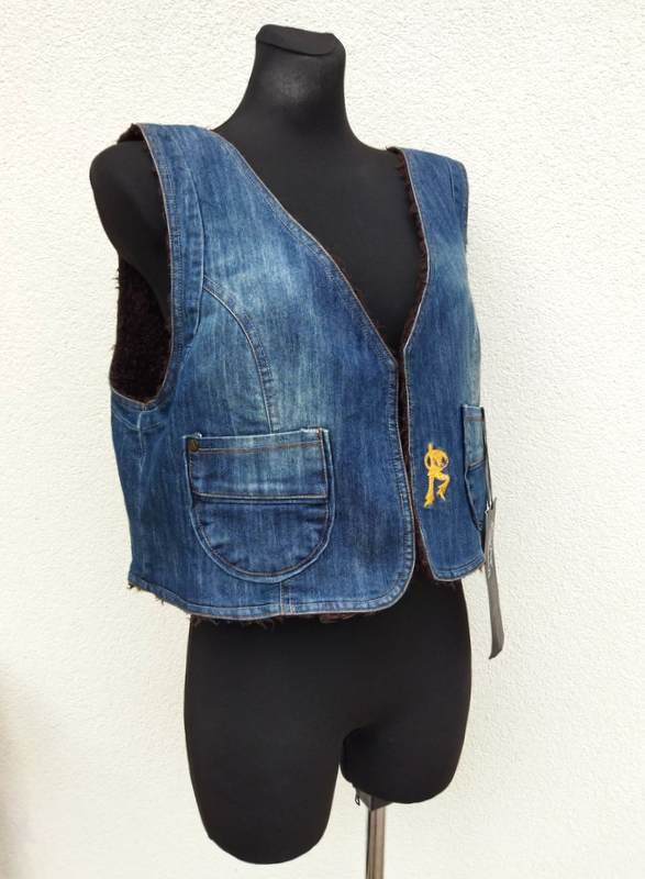 Kamizelka z przecieranego jeansu w niebieskim kolorze , od środka kudłata dzianinowa tkanina a' la baranek w brązowym kolorze. Fason otwarty z dwiema naszywanymi kieszonkami.