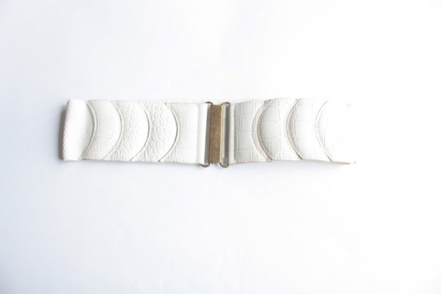 Biały pasek z elastycznej gumy ozdobiony z przodu wstawkami ze skóry ekologicznej. Idealny do podkreślenia talii, będzie pasował do strojów w wielu kolorach. Nie uciska talii tak jak typowe skórzane paski.