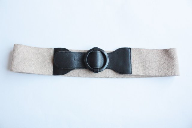 Wyjątkowy pasek wykonany z gumy, która wygląda jak grubo tkana lniana tkanina. Wykończenie ze skóry naturalnej. Pasek ładnie podkreśla talię, zapewniając przy tym swobodę ruchów.