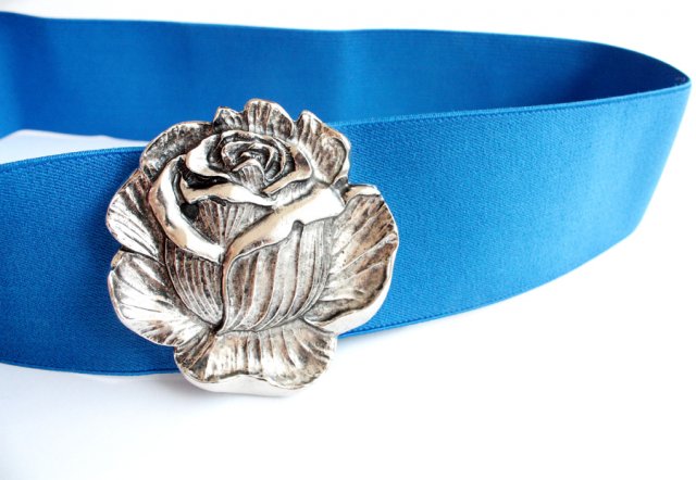 Kobaltowy pasek z elastycznej gumy, zapinany na ozdobną klamrę w kształcie masywnej róży.
