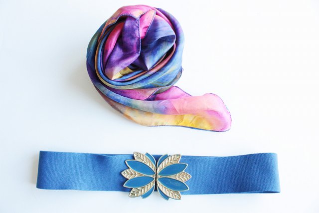 Kobaltowy pasek z elastycznej gumy, zapinany na ozdobną klamrę.