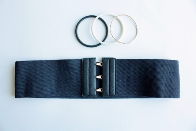 Ciemnogranatowy pasek z elastycznej gumy, zapinany na ozdobną klamrę.