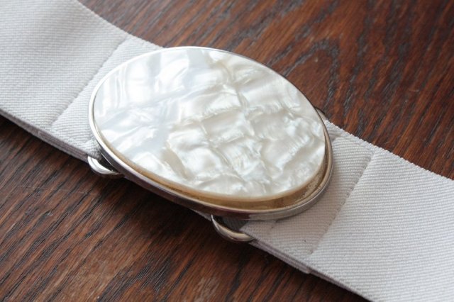 Biały pasek z elastycznej gumy, zapinany na klamrę ozdobioną niezwykle efektownym elementem przypominającym masę perłową. Idealny do podkreślenia talii, będzie pasował do strojów w wielu kolorach.