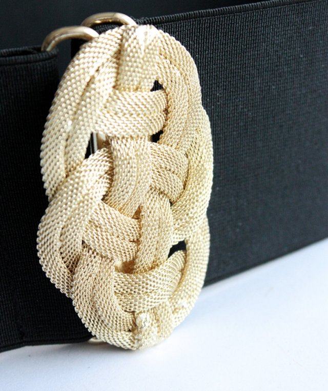 Klasyczny, czarny pasek ozdobiony finezyjną plecioną klamrą w kolorze jasnego złota. Bazą paska jest elastyczna guma, która ładnie podkreśla atuty sylwetki i nie krępuje ruchów tak jak klasyczny skórzany pasek.