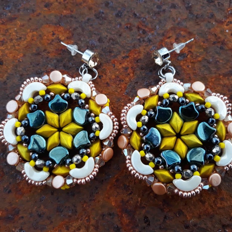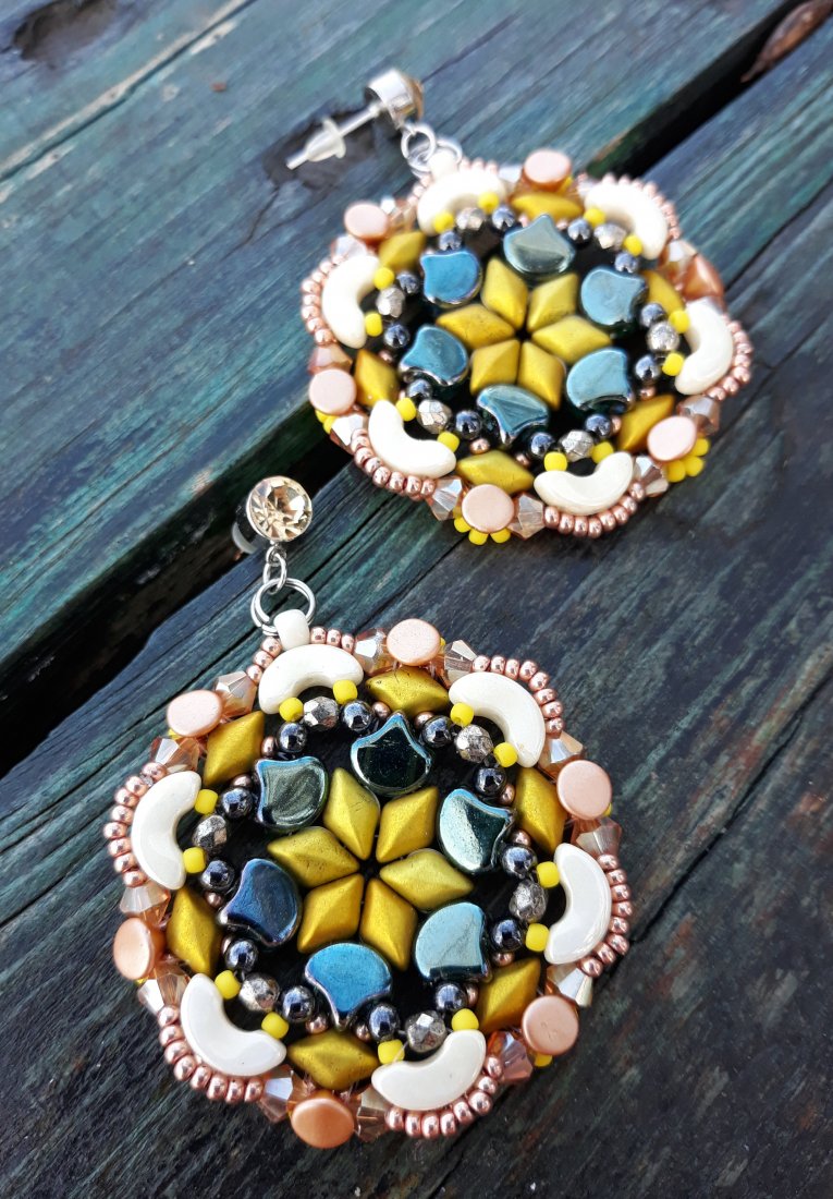 Kolczyki w kształcie rozetek wykonane  ze szklanych koralików w różnych odcieniach  zieleni  i kremu,  zawieszone na ozdobnych biglach ze stali szlachetnej.