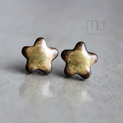 Ceramiczne okrągłe kolczyki, ręcznie wykonane z delikatnej gliny kamionkowej, jednostronnie szkliwione mieszanką zielonych krystalicznych szkliw z efektem plamek, na sztyftach w kolorze srebrnym. Średnica ok. 11mm. Polecam