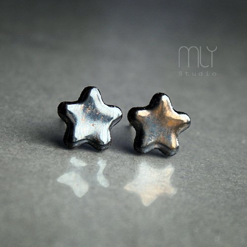 Efektowne kolczyki w formie sztyftów, ręcznie wykonane z delikatnej czekoladowobrązowej gliny kamionkowej, jednostronnie szkliwione metalicznym stalowo szarym szkliwem o pięknym metalicznym połysku, na antyalergicznych sztyftach.długość elementu ceramicznego ok. 11mm, Polecam