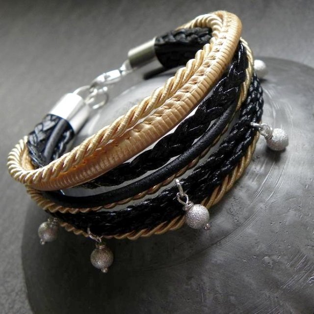 Bransoletka wykonana została z rzemyków skórzanych i ekologicznych, satynowego sznurka oraz elementów metalowych w kolorze srebrnym. Bransoletka będzie odpowiednia na nadgarstek 18-19 cm.