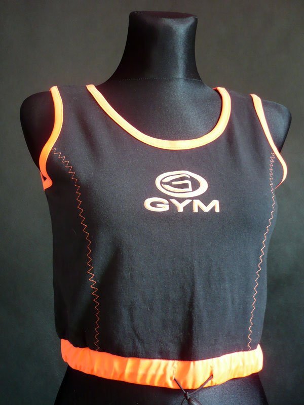 Sportowa bluzka uszyta z czarnej,elastycznej bawełny,ozdobnie stębnowana,na dole ściągana gumką-regulacja.Brzegi obszyte neonową lamówką.Logo z przodu.Pod pachami 90 cm,max.100 cm.