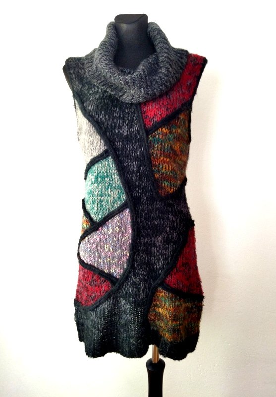 Patchworkowa sukienka o luźnym splocie z puszystej akrylowej włóczki w melanżowych kolorach odcieni zieleni, szarości, czerwieni, brązu i czerni ze śladowymi innymi kolorami, poszczególne fragmenty przodu oddzielone i podkreślone naszywanym rulonikami z czarnej cienkiej włóczki - przód przypomina witrażowe okno, tył jednolity w melanżu czerni z szarością. Z dużym luźnym golfem. Wykończona ściągaczami. Miła, miękka, podatna ciepła i rozciągliwa