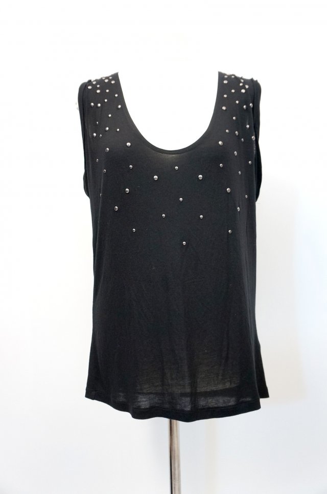 BLUZKA Z DZIANINY 100 % WISKOZA. OZDOBIONA METALOWYMI KÓŁKAMI; BRAK JEDNEGO NA RAMIENIU; NIE JEST TO RZUCAJĄCE SIĘ W OCZY.