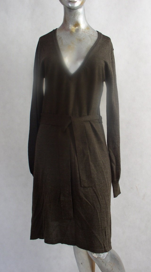 Sukienka z dzianiny firmy H&M.Rozmiar L.Włóczka 75% akryl+25% wełna,cienka,przyjemna w dotyku-nie gryząca.Dekolt w literę V.Rękaw długi na końcu ściągacz.W pasie szlufki z paskiem do wiązania.Stan bardzo dobry.Długość 105 cm.pod pachami 102 cm.
