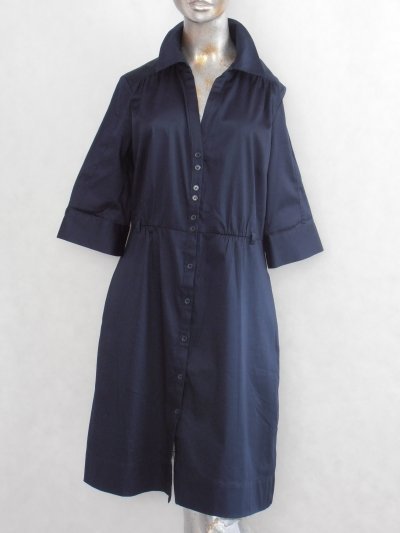 Granatowa sukienka firmy H&M.Rozmiar 44,Materiał 98% bawełna + 2% elastan.Zapinana z przodu na guziki.Odcięta w pasie,lekko marszczona gumką + szlufki na pasek.Kołnierzyk na stójce.Z tyłu karczek + marszczenie na środku.Po bokach kieszenie,wpuszczane do środka.Rękaw 3/4,szeroki,zakończony mankietem bez zapięcia.Stan bardzo dobry,brak śladów używania.Długość 97 cm.pod pachami 110 cm.