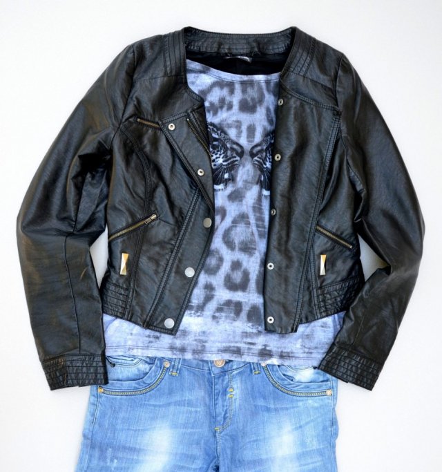 Świetna stylowa kurteczka marki H&M. Kolor czarny, imitacja skóry. Fason krótki, taliowany, z modnym skośnym zapięciem. Dekolt okrągły. Rękawy długie, krój prosty z regulacją na zapinane dwie napy. Z przodu trzy małe kieszonki zapinane na zameczki. Zapinana na zamek błyskawiczny i napy. Na podszewce.