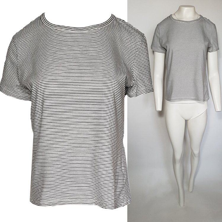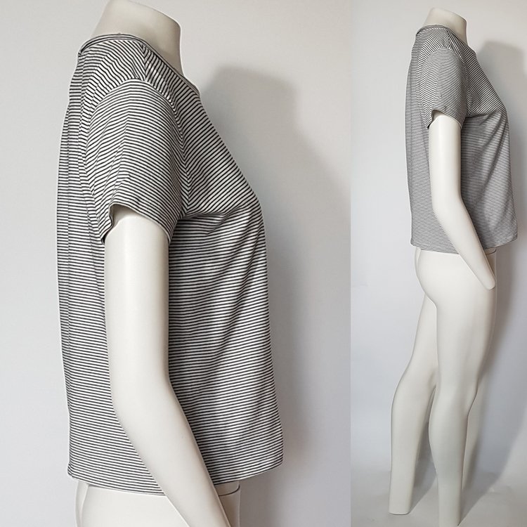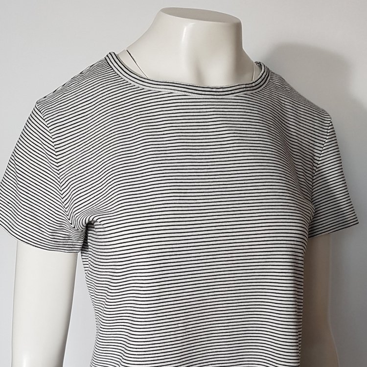 Bluzka z krótkim rękawem z przyjemnej dzianiny bawełnianej, biała w drobne czarne paski. Deformacje układu pasków, widoczne miejscami na zdjęciach są wadą aparatu, który nie radzi sobie najlepiej z drobnymi paskami.