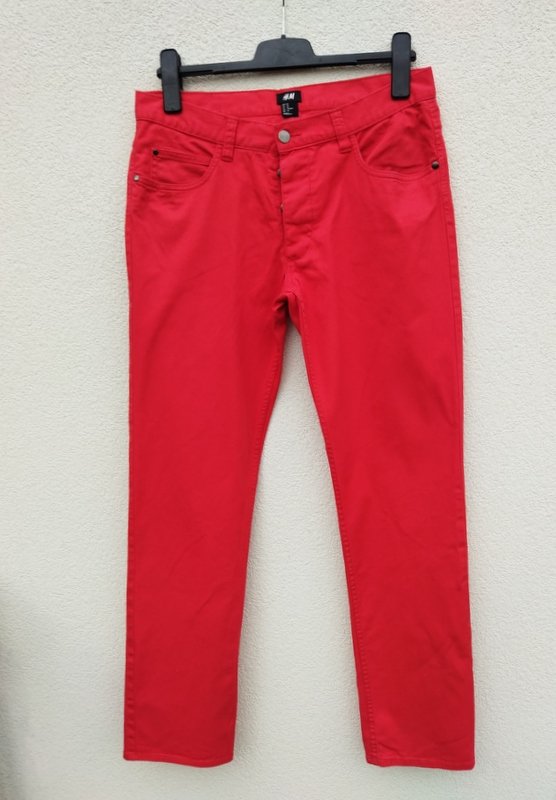 Zgrabne spodnie z bawełnianej tkaniny w kolorze nasyconej czerwieni. Zapinane z przodu na ukryte pod plisą napowe guziki. 5 klasycznych kieszeni Z przodu dwie wpuszczane kieszenie i jedna mała , z tyłu dwie naszywane.