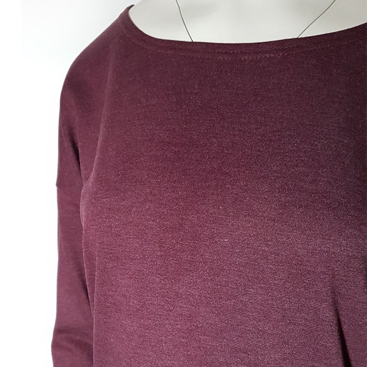 Bluza dresowa, dekolt okrągły, linia ramion obniżona, rękawy 3/4 wykończone wywinięciem. Komfortowy basic na co dzień. Dzianina melanżowa w kolorze rozbielonego buraczanego fioletu.