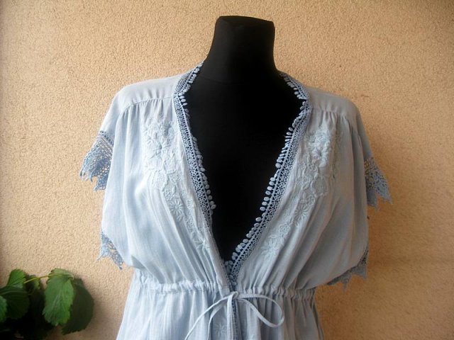 Narzutka/bluzka ze 100% organicznej bawełny. Ekskluzywna linia marki H&M. Pięknie wykończona haftem i koronką. Stan bardzo dobry. Rozmiar z metki 38, ale fason luźny więc na 40 też będzie dobra. Podaję wymiary mierzone na płasko;