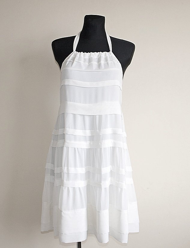 Letnia, zwiewna sukienka, marki H&M, z ekskluzywnej linii conscious, w kolorze śmietankowym. Pod spodem podszewka. Rozmiar z metki 36, mnie wydaje się większa. Materiał 100% recycled poliester. Wkładana bez zamka.