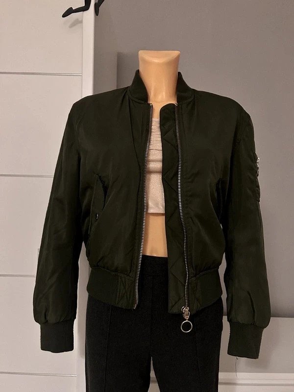 Bomberka marki h&m linii divided, rozmiar z metki to m 38. Ma ciemny kolor zielony, jest zasuwana na zamek. Jest ocieplona w środku.