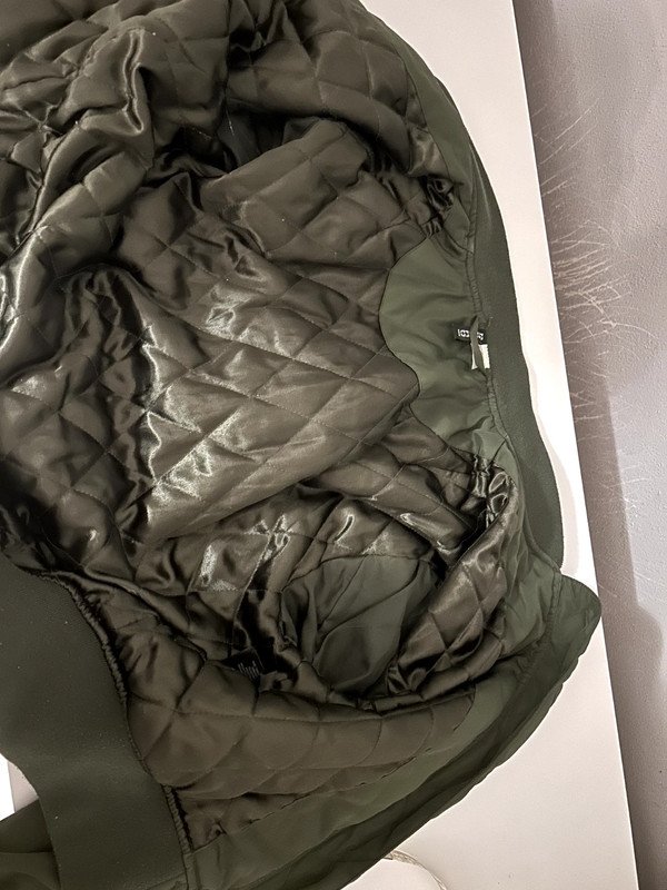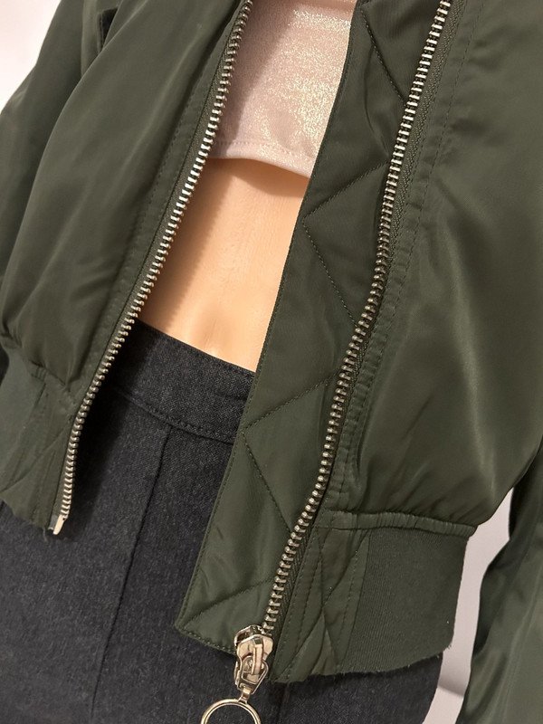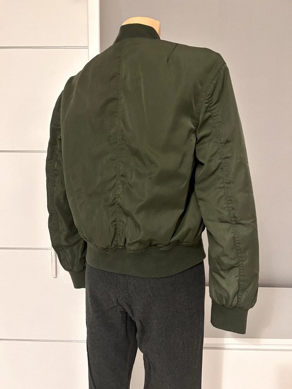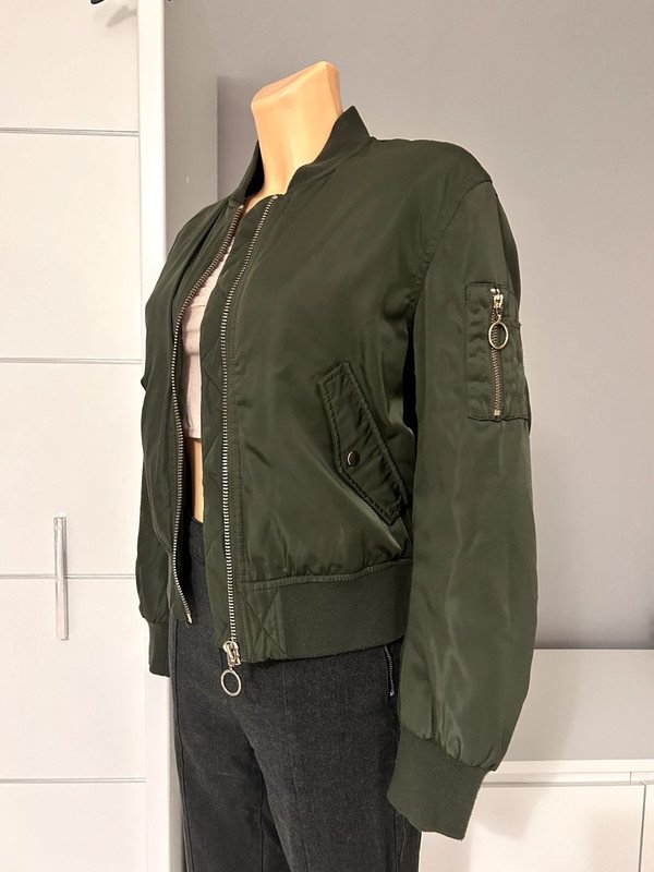 Bomberka marki h&m linii divided, rozmiar z metki to m 38. Ma ciemny kolor zielony, jest zasuwana na zamek. Jest ocieplona w środku.