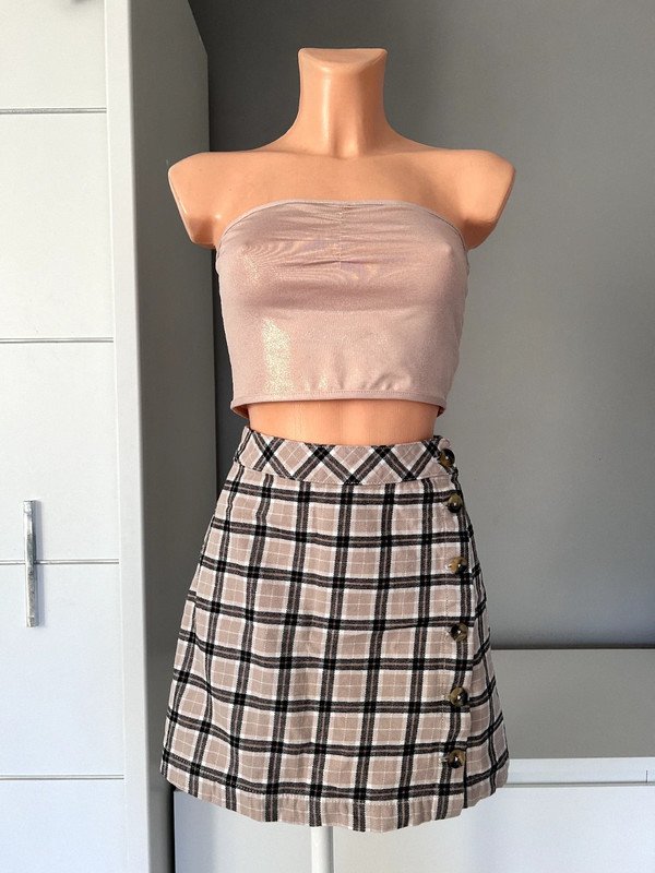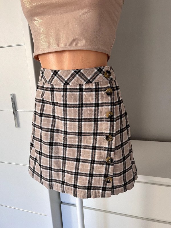 Spódniczka marki h&m linii divided. Dopasowana w talii, zapinana na guziki. Ma piękną kratkę. Piękny beżowy i czarny kolor sprawiają, że idealnie pasuje do szafy kapsułowej. Wykonana w 100% z bawełny, nadaje się idealnie na lato.