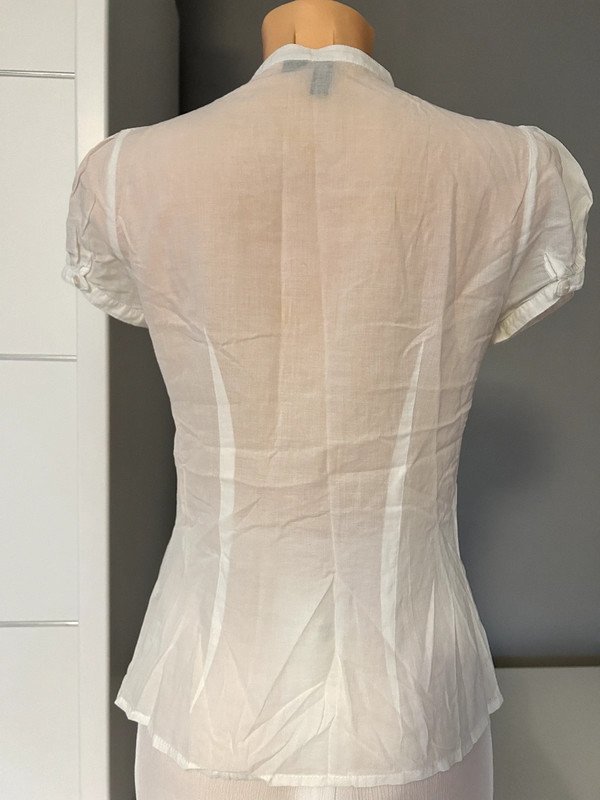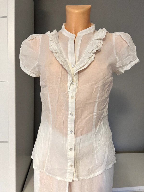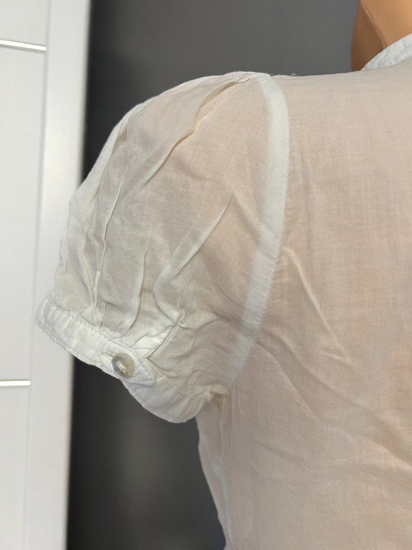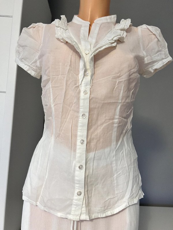 Biała bawełniana bluzka H&M Divided rozmiar 36. Cieniutka, przewiewna, ładnie dopasowana, taliowana. Krótki rękaw, zapinana na guziki, ozdobna falbanka, żabot z przodu. Old money style, szafa kapsułowa. Polecam