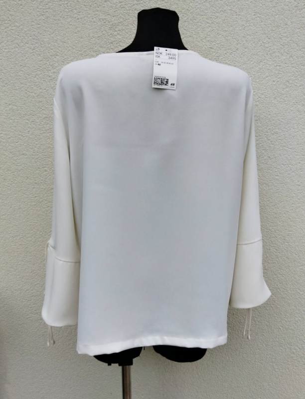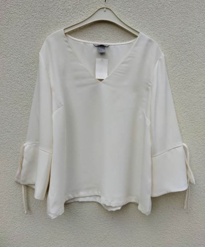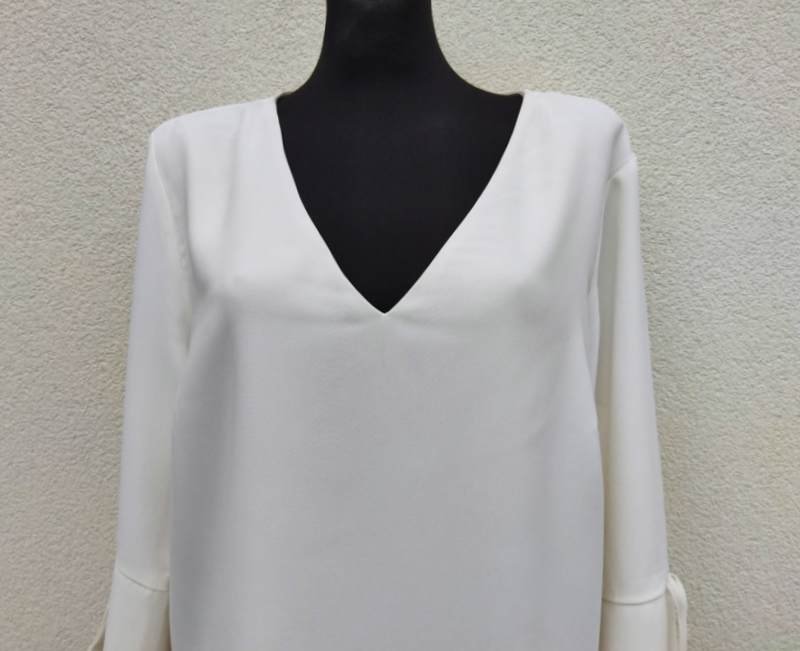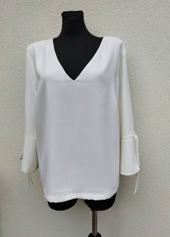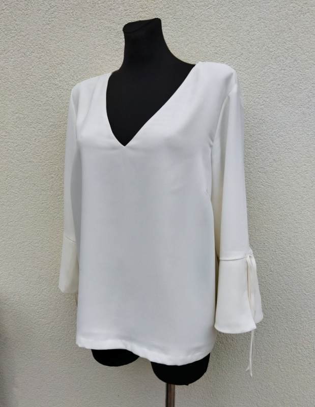 Elegancka bluzka z poliestrowej tkaniny w kolorze ecru z efektownymi rękawami z wysokimi rozcinanymi mankietami z troczkami . Dekolt w szpic. Przód na podszewce z cienkiej żorżety w kolorze bluzki.
