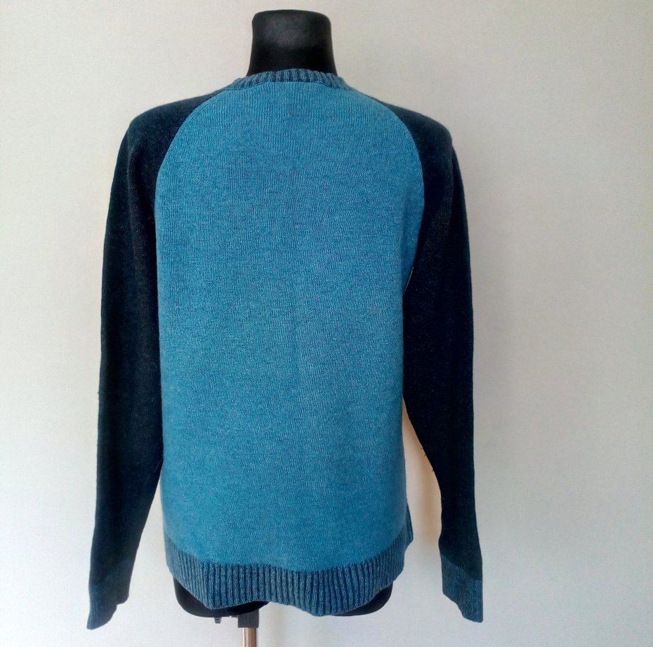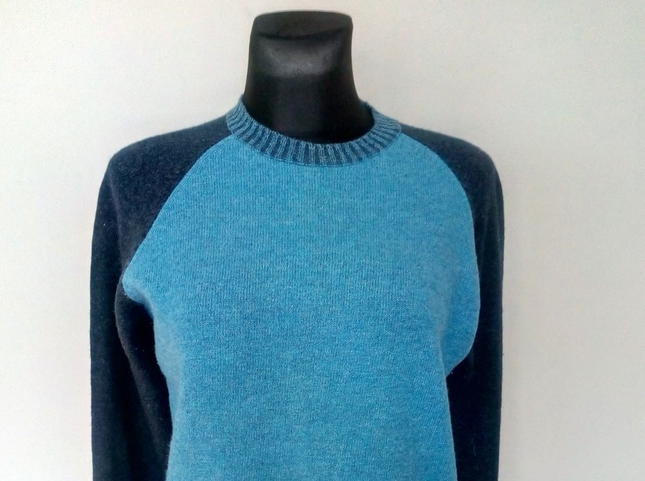 Sweter z wełny jagnięcej, kolor niebieski i granatowy, rękawy raglanowe, ściągacz u dołu swetra i przy rękawach