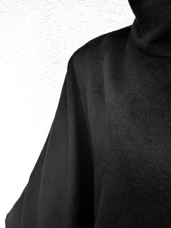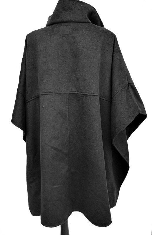 Uniwersalna peleryna/poncho z flauszowej tkaniny z włosem w czarnym kolorze. Linia rękawa zaznaczona zapięciem na guzik po wewnętrznej stronie. Z kołnierzem typu wyższa stójka , z dwiema wpuszczanymi kieszeniami. Zapinana na oblekane tkanina zatrzaski.
