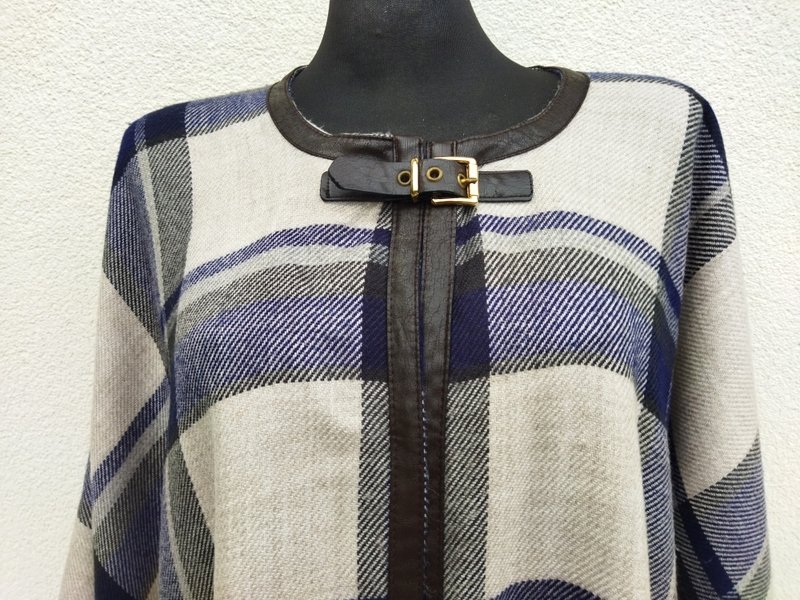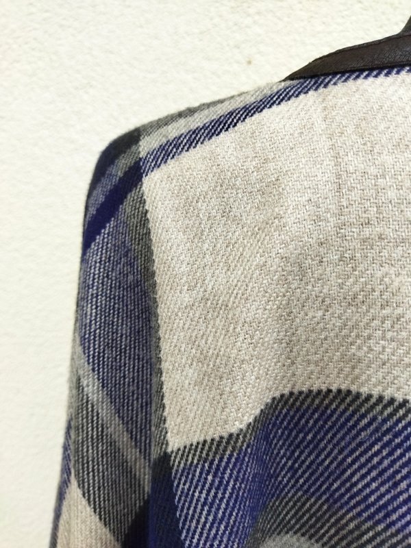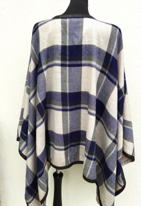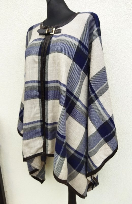 Miłe poncho z tkaniny w kratę w kolorystyce jasnej i ciemnej szarości, granatu i czerni, z czarnymi lamówkami. Zapinana pod szyją paseczkami z klamerką . Minimalistyczny prosty krój w kształcie prostokąta z zaznaczona linią rękawa.