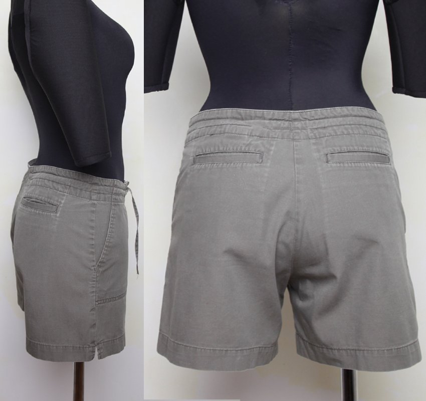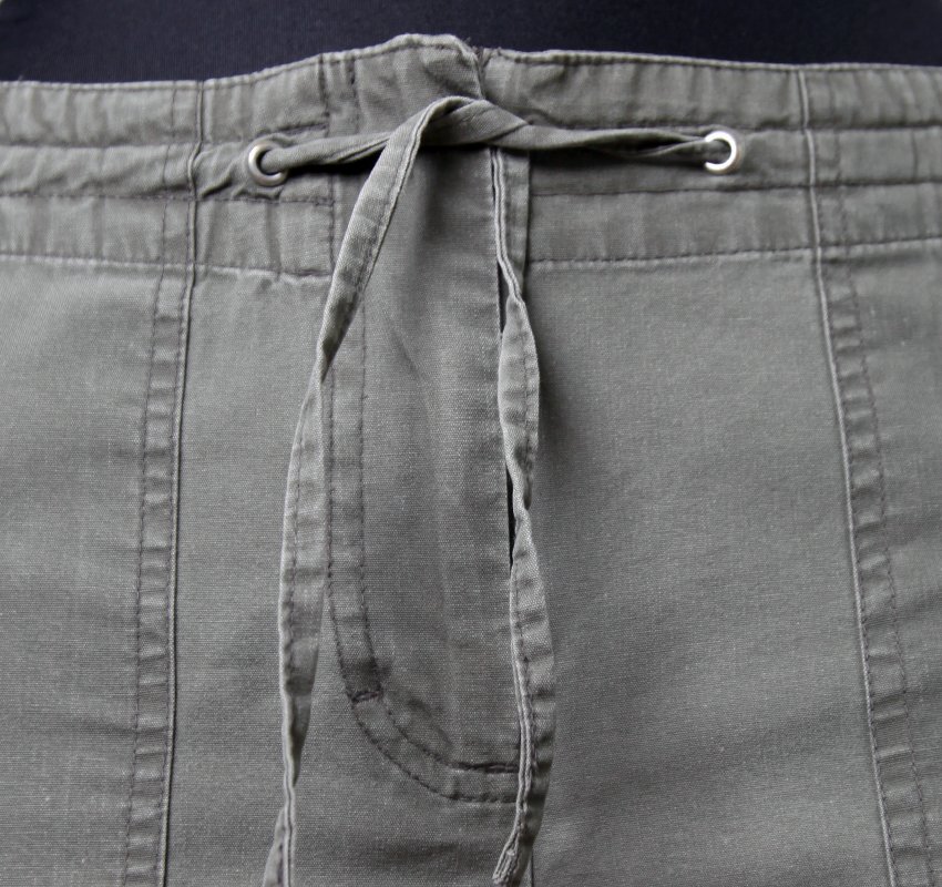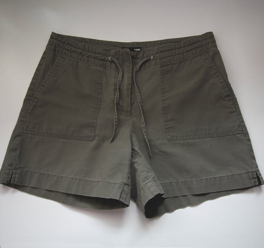 Krótkie spodnie/ szorty, sięgające około połowy uda. Kolor zielony / jasny khaki, z przodu 2 kieszenie nakładane, z tyłu 2 kieszenie wpuszczane, wykończone listewką. Spodenki zapinane na zamek, w pasie wiązane sznurkiem. Idealne na wakacyjne wyjazdy na biwak, pod namiot, na wycieczkę w góry itp.