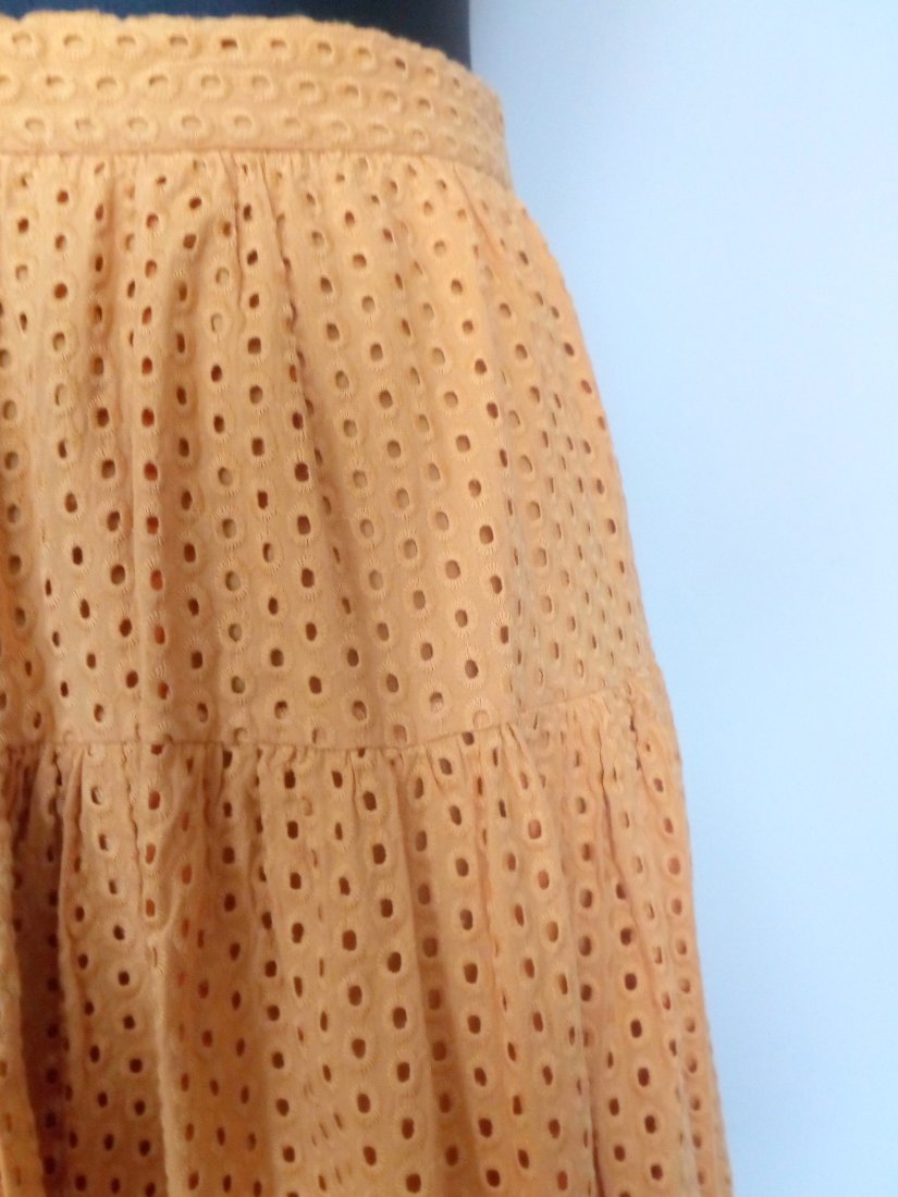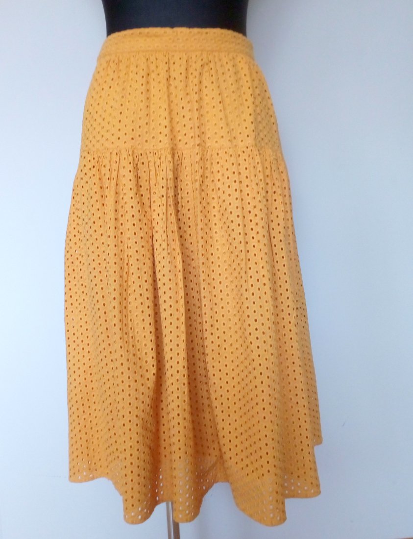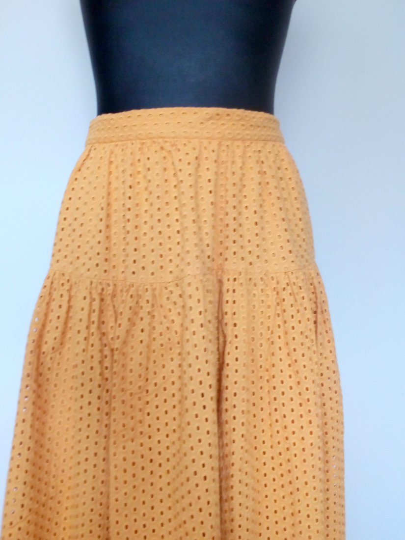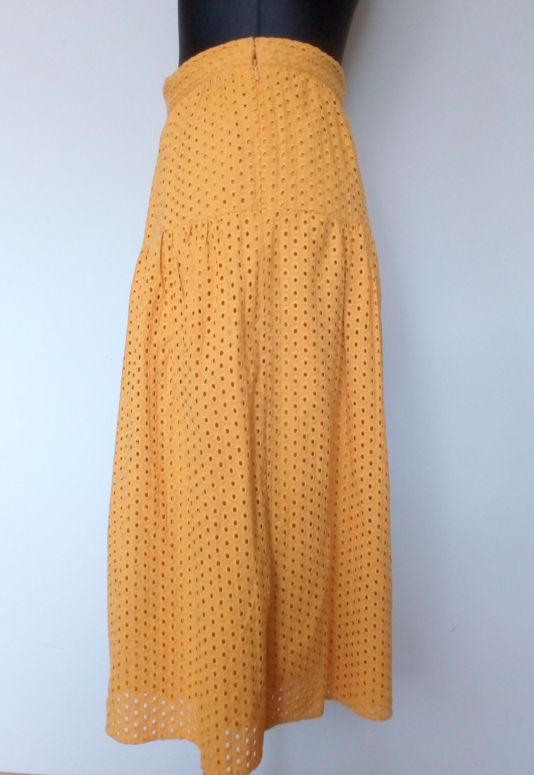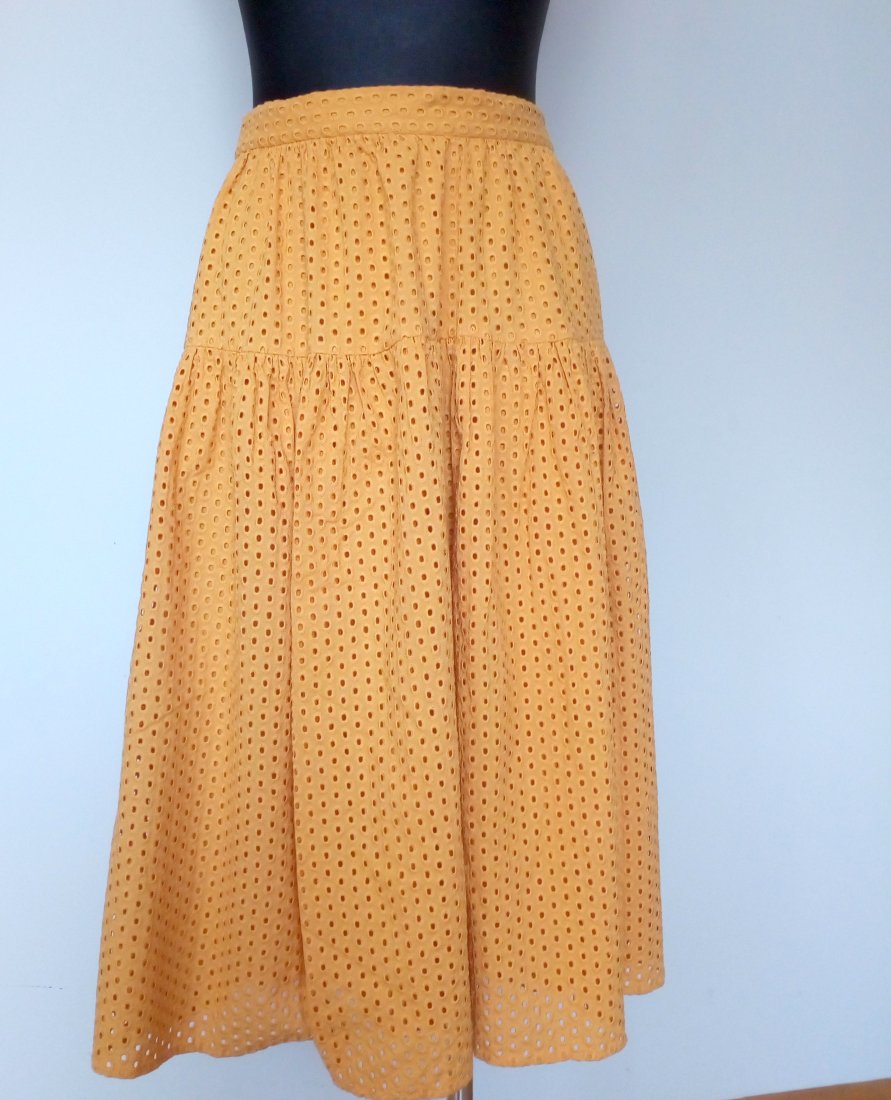 Bawełniana spódnica z ażurowym haftem, kolor żółty - słonecznikowy, u góry na pasku i karczku, od karczku marszczona, zapinana z boku na zamek i haftkę, od środka bawełniana podszewka w identycznym kolorze jak spódnica