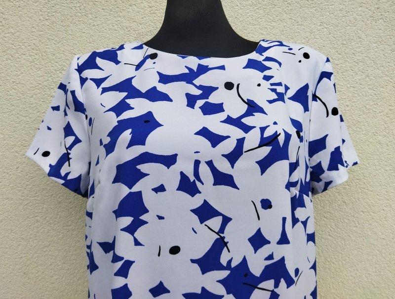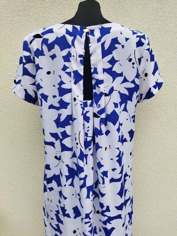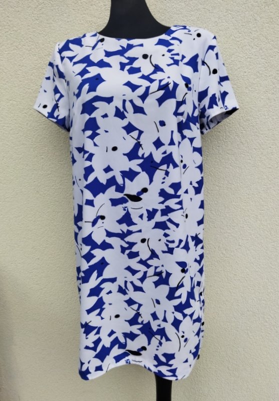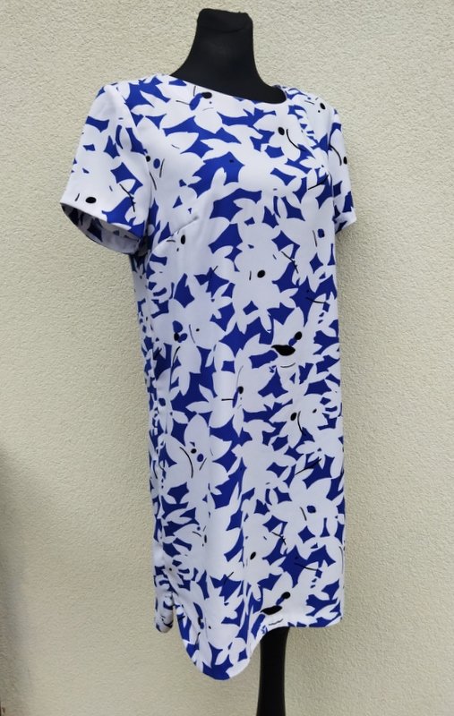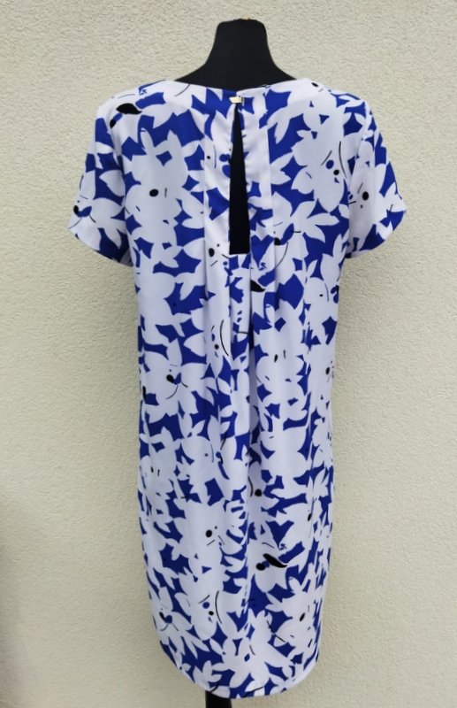 Piękna sukienka o minimalistycznym kroju z poliestrowej tkaniny z białym wzorem kwiatowym z odrobiną czerni na kobaltowym tle. Ciekawy rozwiązanie dekoltu z tyłu z rozcięciem z metalowa zapinka i dwiema kontrafałdkami. .Asymetryczna - dłuższa z tyłu, z zaokrąglonymi rozcięciami po bokach