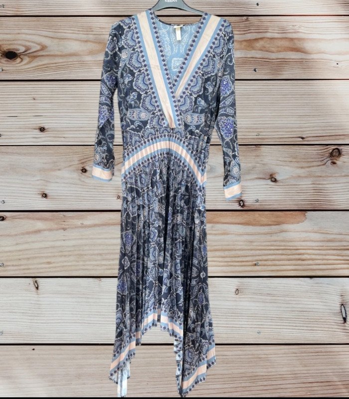 #ubrania #sukienka #damska #niebieska #plisowana #asymetryczna #wewzory #niebieska #granatowa #zdlugimrekawem #zdługimrękawem #dekoltwserek #handm