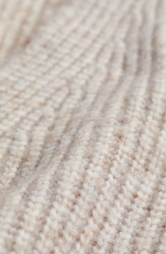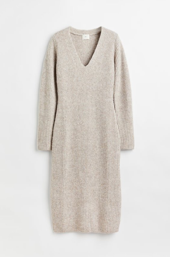 Jasnobeżowa dopasowana sukienka do połowy łydki, wykonana z prążkowanej mieszanki wełny. Dekolt w serek, długie rękawy i prosty dół. Nowa, z metką.