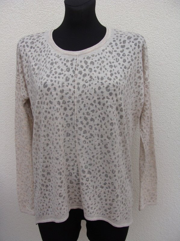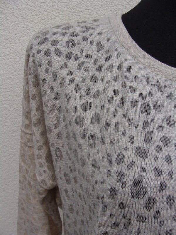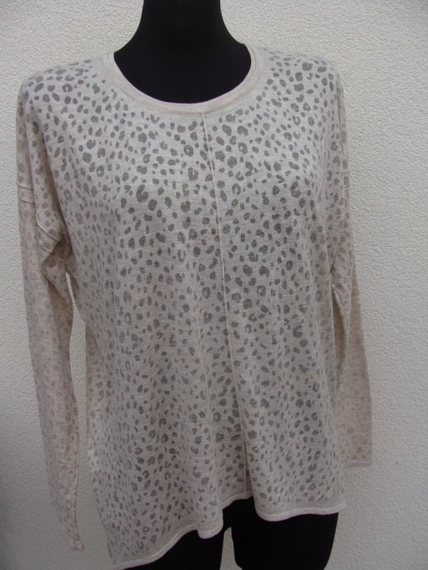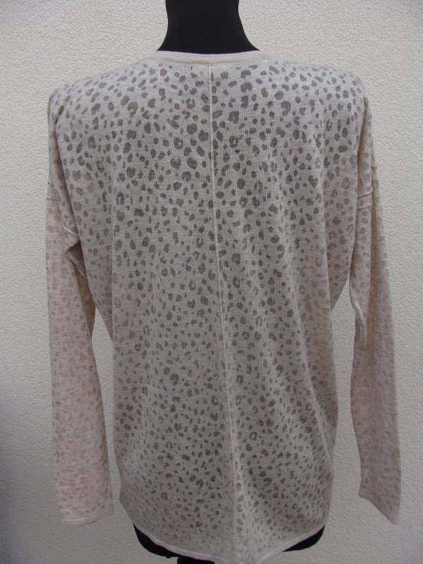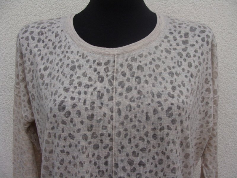 Sweterek z cienkiej dzianiny w zwierzęce cętki w beżowo- oliwkowej kolorystyce. Asymetryczny przód krótszy od tyłu.