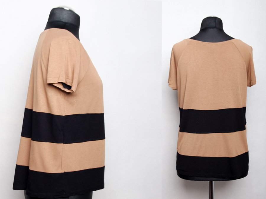 T-shirt, bluzka z krótkimi rękawami, w beżowo-czarne pasy, wykończona okrągłym dekoltem. Klasyk, sprawdzi się w różnych zestawieniach, zarówno eleganckich jaki i na luzie.