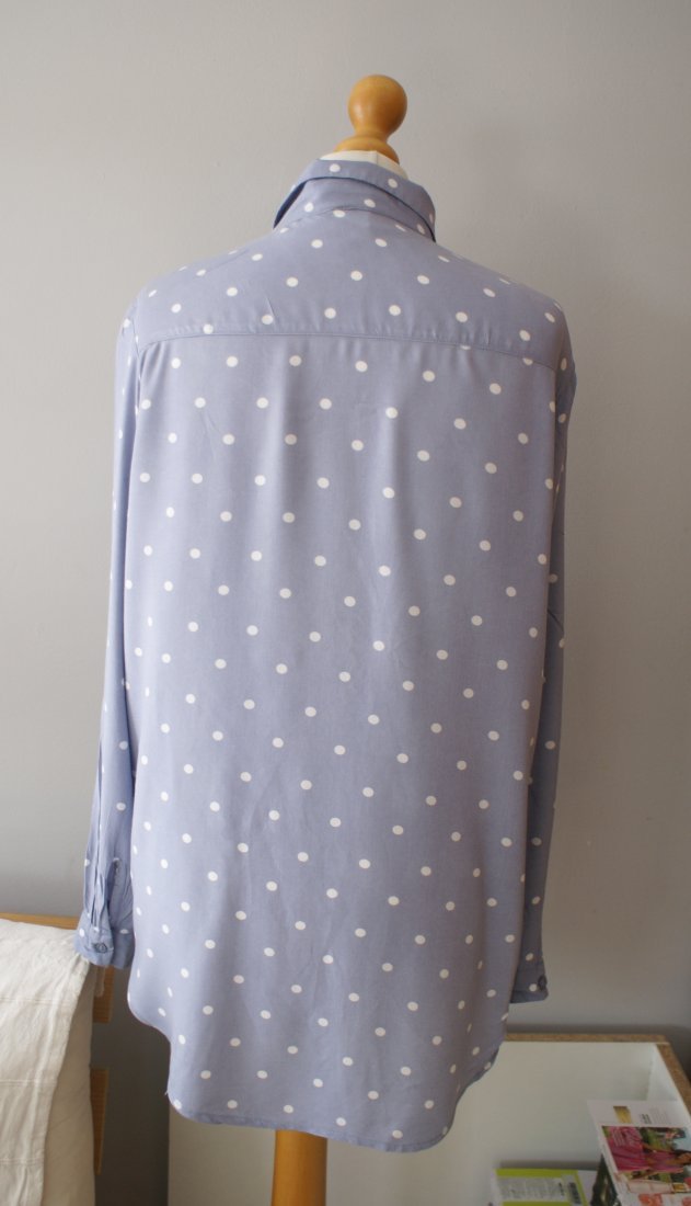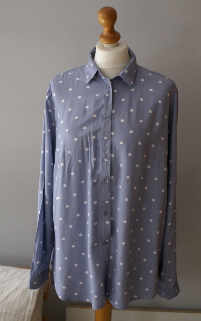 Prosta koszula z miękkiej wiskozowej tkaniny. Kołnierzyk, guziki z przodu. Długie rękawy z wąskim zapinanym mankietem, zaokrąglony dół. Rozmiar M. Oversize. Szerokość od pachy do pachy 55 cm, długość 81 cm. Długość rękawa: 60 cm