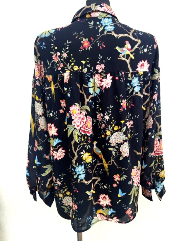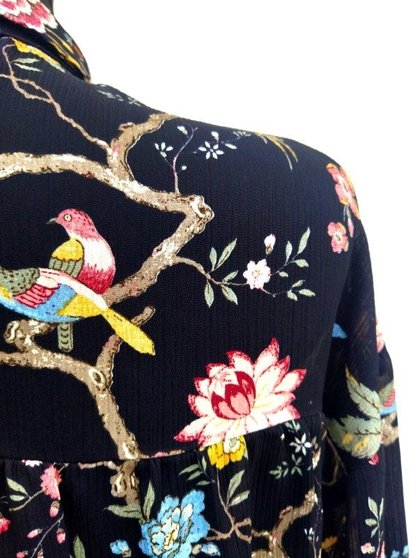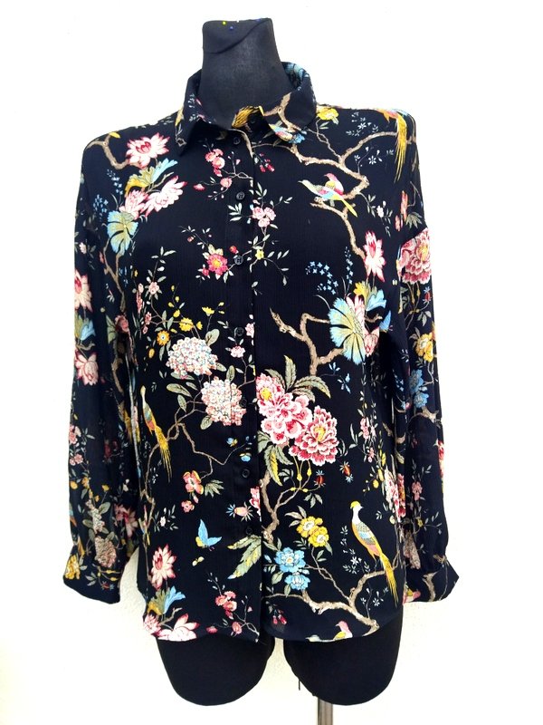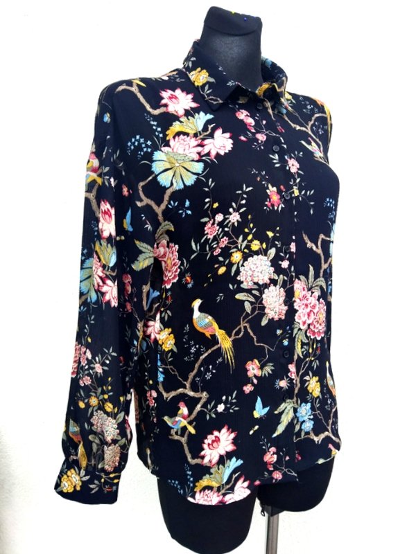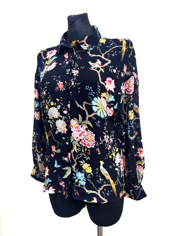 Bluzka z cienkiej żorżety poliestrowej z kolorowa tropikalną roślinnością i rajskimi ptakami na czarnym tle. Zapinana na małe guziczki, z kołnierzykiem na stójce , rękawy z mankietem na guziczek. Asymetryczna - zaokrąglony tył dłuższy od przodu.