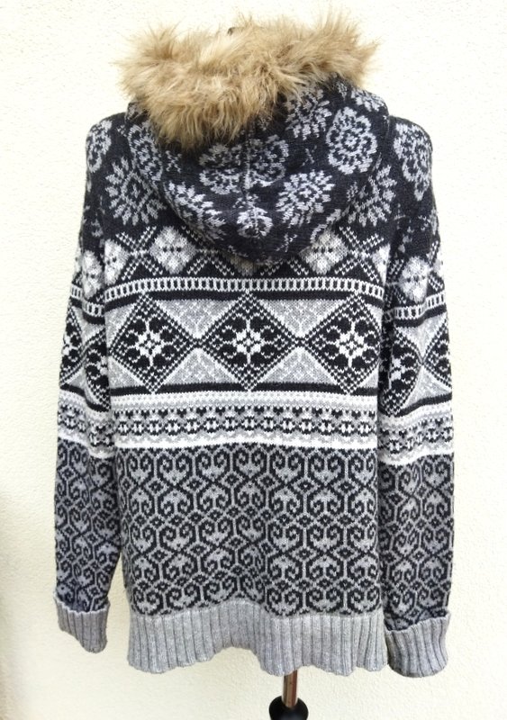 Dłuższy wzorzysty sweter z przewagą bawełny w składzie w kolorystyce dwóch odcieni szarości, czerni i bieli. z kapturem obszytym sztucznym futerkiem. Zapinany na mocne metalowe zatrzaski. Wykończony ściągaczami.