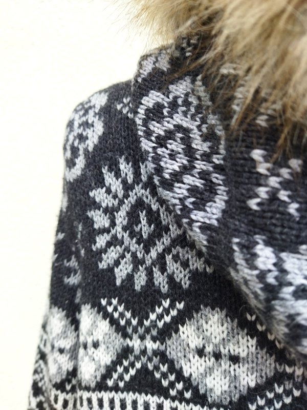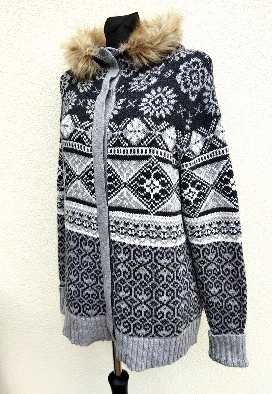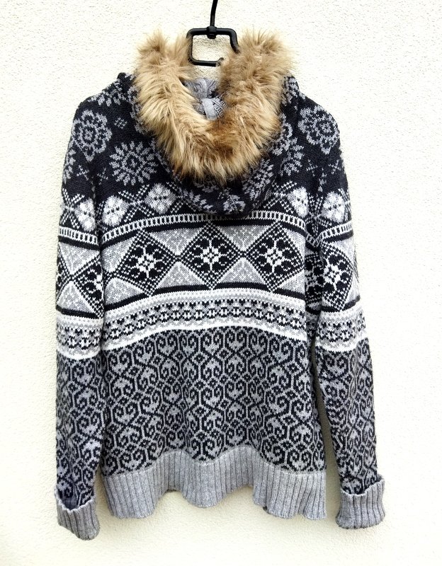 Dłuższy wzorzysty sweter z przewagą bawełny w składzie w kolorystyce dwóch odcieni szarości, czerni i bieli. z kapturem obszytym sztucznym futerkiem. Zapinany na mocne metalowe zatrzaski. Wykończony ściągaczami.