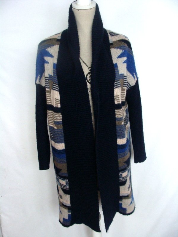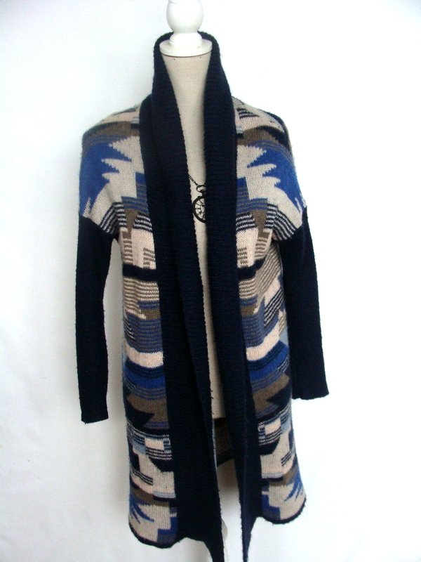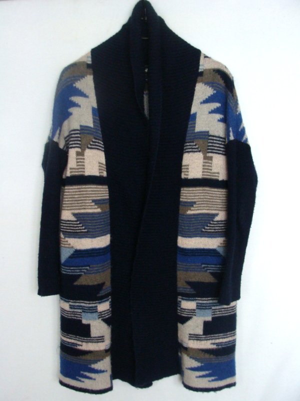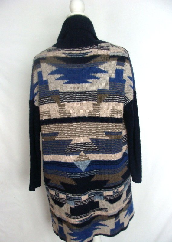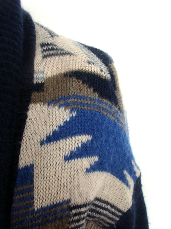Długi , wzorzysty akrylowy sweter z wełną i angorą Luźny oversizowy fason z wąskimi rękawkami z szeroką ściągaczową granatową plisą z przodu przechodzącą w szalowy kołnierz . W tym samym kolorze wąskie rękawy. Wzory w kolorach granatu, złamanej bieli, brązu w odcieniu cappuccino, ciemno niebieskim i błękitu w gołębim odcieniu.